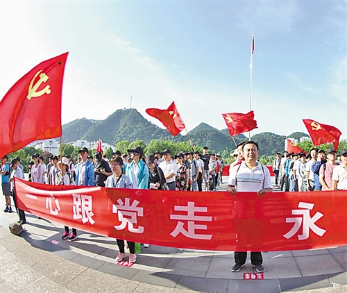 6月27日,安徽省歙縣舉辦“一心跟黨走 永遠(yuǎn)在路上”活動(dòng)迎接黨的生日。當(dāng)日,200名縣直機(jī)關(guān)黨員和非公企業(yè)的黨員從縣城出發(fā),沿著革命先烈走過的足跡,到達(dá)溪頭鎮(zhèn)汪滿田村紅軍紀(jì)念碑。活動(dòng)中舉辦升國旗、唱國歌儀式,沿途宣傳環(huán)保、扶貧、文明創(chuàng)建等內(nèi)容。吳建平攝